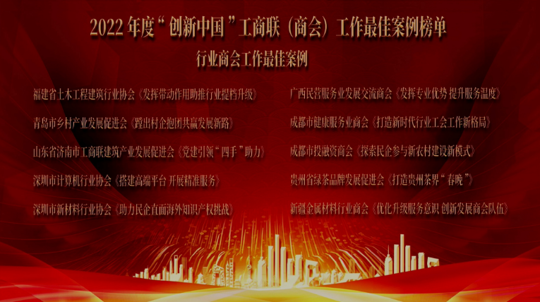 由中华工商时报发起的2022年度“创新中国”工商联(商会)工作案例推选活动,经过初选、复核审定,最终产生2022年度“创新中国”工商联(商会)工作案例和优秀案例榜单。