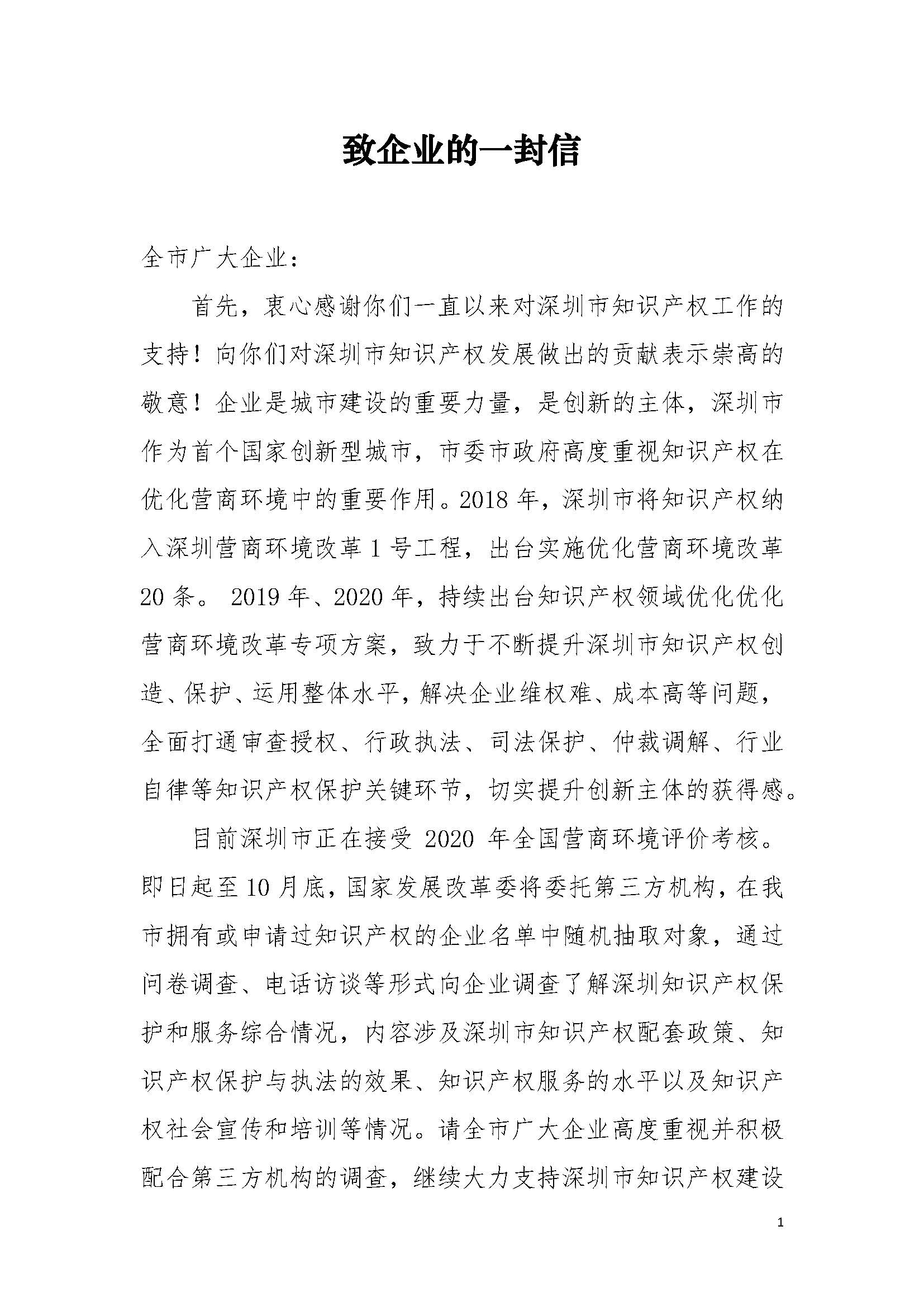 深圳市市场监督管理局致企业的一封信