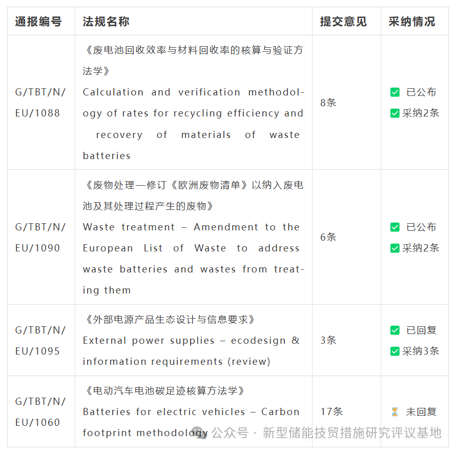 一、法规评议与意见采纳成果国家新型储能技术性贸易措施研究评议基地研究评议团队2024-2025年度围绕四项欧盟关键法规(G/TBT/N/EU/1060、1088、1090、1095)积极组织评议会和行业研讨会,一共向WTO/TBT提交34条评议意见。经欧盟正式回复和发布的最终法规文件确认,共7条意见被采纳或部分采纳,其中:G/TBT/N/EU/1088(废电池回收效率与材料回收率的核算与验证方法学):采纳2条G/TBT/N/EU/1090(危险废物清单修订):采纳2条G/TBT/N/EU/1095(外部电源产品生态设计与信息要求):采纳3条