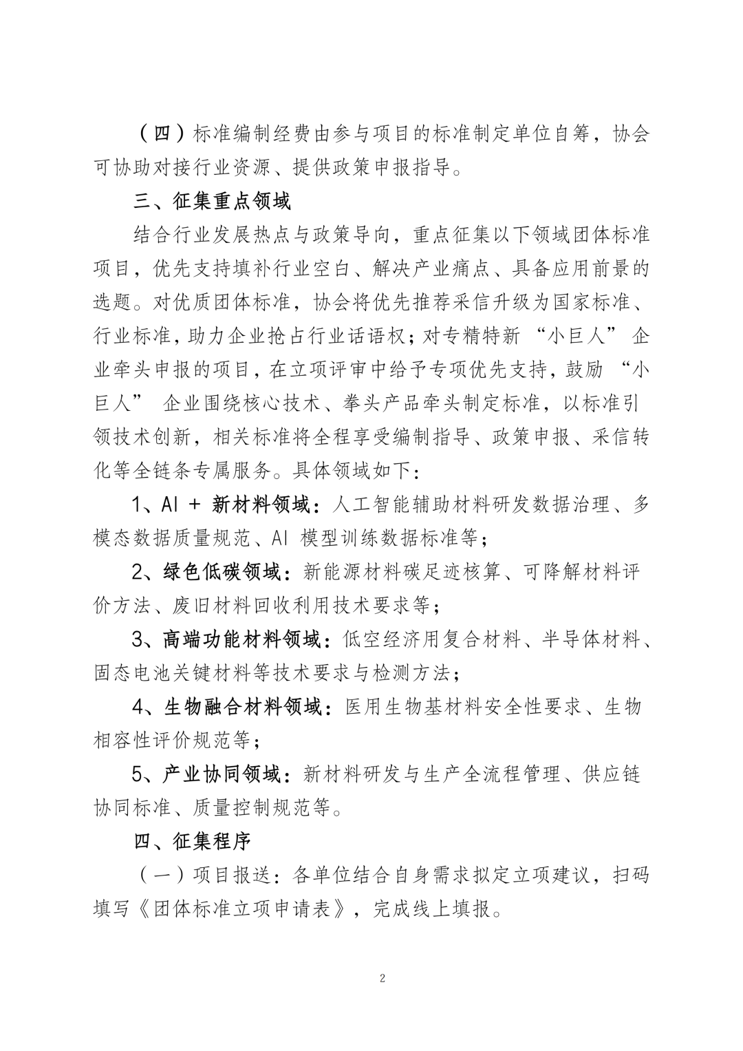 为深入贯彻《中华人民共和国标准化法》《广东省标准化条例》,紧扣国家新质生产力培育“人工智能 +” 战略,聚焦新材料产业高端化、智能化、绿色化转型需求,充分发挥团体标准对产业发展的引领支撑作用,现面向全体会员单位及行业优质企业,公开征集2026 年度首批团体标准制定项目。(后附征集通知文件)