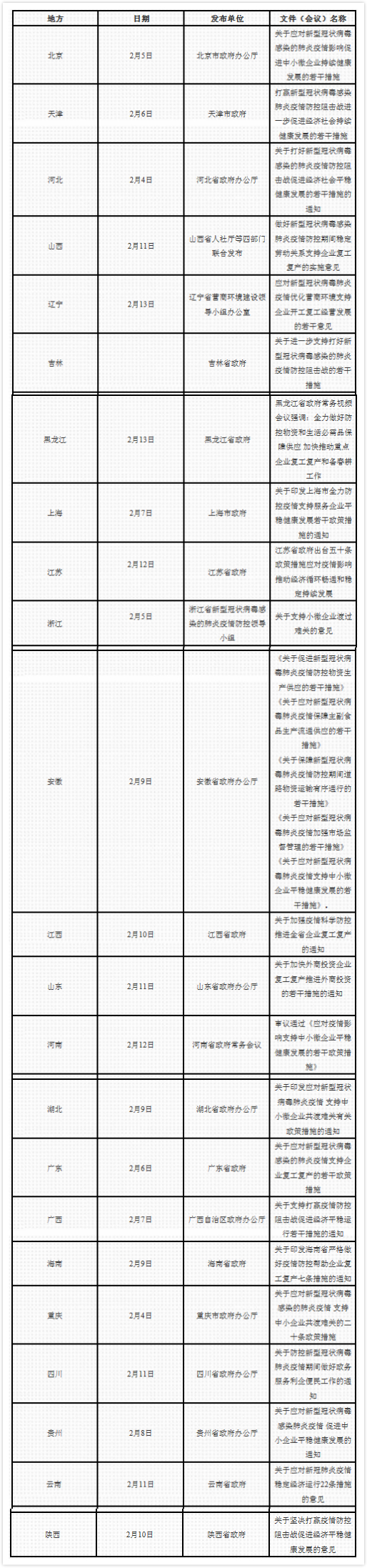 截至2月14日,共有23个省、自治区、直辖市出台了促进企业复工复产的措施。其中,天津、吉林、黑龙江、上海、江苏、江西、广东、海南、云南、陕西等10个省、直辖市以政府名义发布,北京、河北、安徽、山东、湖北、广西、重庆、四川、贵州等9个省、自治区、直辖市以政府办公厅名义发布,辽宁以省营商环境建设领导小组办公室名义发布,浙江以省新冠肺炎疫情防控领导小组名义发布,河南召开的省政府常务会议研究通过了相关措施,山西省人社厅等四部门联合发布相关措施。具体如下。