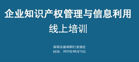 为落实广东省知识产权人才“十四五”规划,全面加强广东省知识产权人才队伍建设,完善知识产权人才结构,拓宽知识产权人才培养渠道,2022年6月13日下午,在深圳市市场监督管理局的指导下,协会举办了企业知识产权管理与信息利用线上培训活动,旨在提高新材料创新主体的知识产权创造和管理能力。
